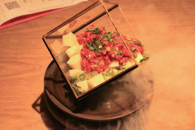 米豆腐的装盘造型别致又好看,看着就是一种享受。下面放有干冰,刚上桌时还是雾气缭绕的,把米豆腐环绕其中,很仙的感觉。米豆腐口感爽滑,一口下去米香就溢于唇舌之间……