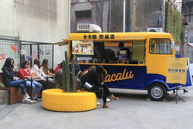 二厂另一个重要的元素是各种店铺,它们是餐厅、是小吃铺、是咖啡店,但有个共同点就是店名取得文艺、店面装修精致,每一家小店都是一个景点,游客轮流拍着照。尽管大多只是单纯拍照合影,并没有消费,但店家们也丝毫没有不悦之色,大概这些店存在的价值之一也是让人拍照吧,佛系开店,图个开心。