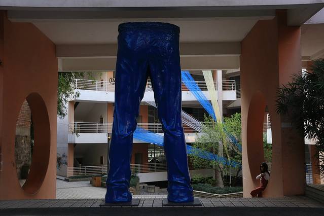 和涂鸦街一样,校园内也随处都是色彩斑斓的涂鸦,还有各种创新又大胆的设计,比如嵌进墙内的陶罐、身体后仰90°的妇女和XXX…L的运动裤雕塑。