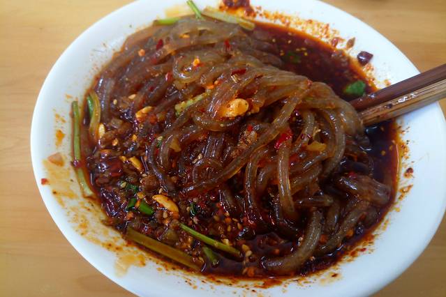 除了小面,酸辣粉也是重庆比较受欢迎的面食,因为太过重口一般不会在早上吃。我就不一样了,去地铁站路上看到一家酸辣粉店突然就想吃了,果断来了一碗。虽然叮嘱老板要少辣,但端上来的那一刻我就知道老板要么是没听进去,要么觉得我操着一口标准的重庆话跟他说少辣是开玩笑……但还好没我想象中那么辣,就是嘴唇周围一圈会有点出汗的程度。红薯粉混着杂酱和花生米,再撒一点香菜,酸香中带点麻辣,很是过瘾。