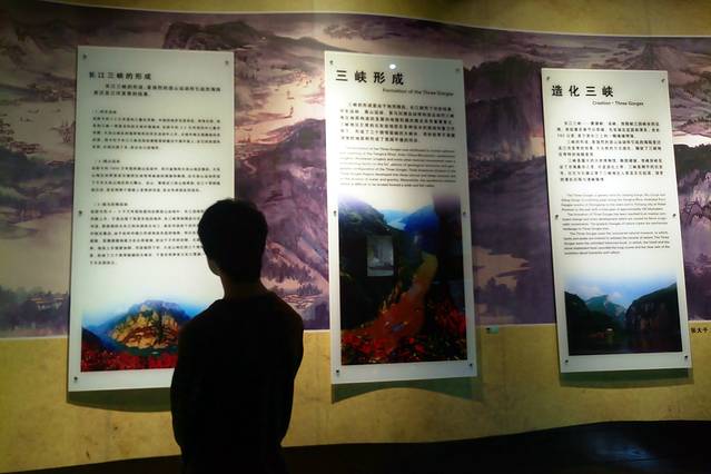 三峡博物馆有四层楼,每层楼都有几个展厅,全部逛下来是非常吃力的,所以我们只选择了部分展厅参观。壮丽三峡特别有意思,完整详细地重现了三峡形成的过程以及三峡的动植物、民居、纤夫和故事传说等,看完完全不能自拔,真无愧壮丽三峡几个字。从展厅出来刚好看到不少人在排队,走近一看原来是看“大三峡“环幕电影的,于是我们也加入了排队大军。环幕电影是免费开放的,上午有一场,下午两场,一场大概20分钟,站着观看。环幕电影厅不算大,但厅内银幕并不小,非常长,观众是站在电影厅的中央,左右两边都可以看,但要想看到整个画面就得不停地左右移动,并且头一直是上仰的状态,说不累是假的,但三峡的神奇和秀丽也让人惊叹,值得一看。