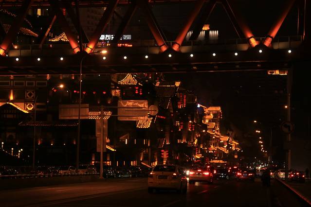 洪崖洞的夜景十分惊艳,每天都有人扛着长枪短炮在各个角度拍摄洪崖洞,以及附近的千厮门大桥和重庆大剧院。除了夜景,洪崖洞的地形也让不少外地人直呼Amazing 和Unbelievable,至今仍然有朋友追问我为什么洪崖洞1楼出去是大马路,11楼出去还是大马路。