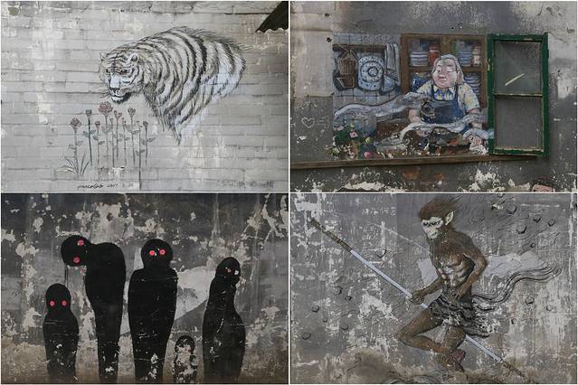 此外,墙上的各种涂鸦也变多了,从上新街地铁站的出口一进入下浩,就看到了“心有猛虎,细嗅蔷薇”的画面。再往前是一幅虚实结合的窗景画,只是一扇窗子不知去向,墙面也脱落了不少。一路走下来,在各个地方都能看到大大小小的墙绘,有的一下子就能吸人眼球,而有的一不注意就会错过……感谢这些五颜六色充满了故事的画面,给下浩带来不少生机。我想,大概是有人以涂鸦的方式在纪念这条老街。