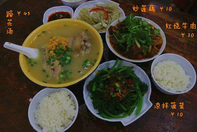 招牌菜蹄花汤是不得不点的,蹄花汤里是一整只猪蹄,口感软糯,肥而不腻,沾上油蹀后味道更好。蹄花汤也十分好喝,就是略清淡了些。除了蹄花汤后,店里就主要是各种蒸烧凉菜了。加上一个住黄桷坪的朋友,我们一行三人,点了蹄花汤、红烧牛肉、炒藕片、凉拌菠菜4个菜,菜的分量很实在,最后剩下不少,一共也才花费100元。