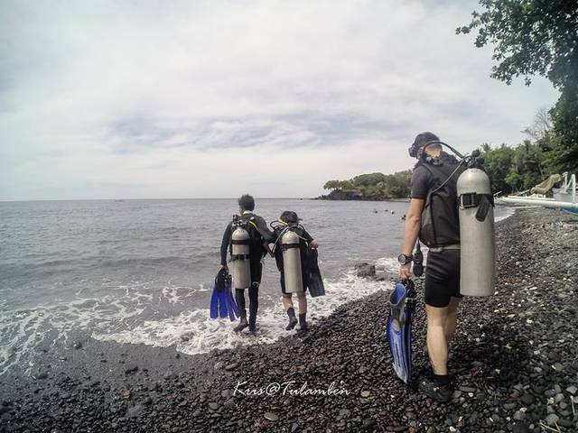 岸潜,都是火山石,踩下去脚痛,还好潜店提供了鞋套给我们。 潜导很nice, 看我码子小,一路搀扶着我下水 海里浪挺大的,我几乎没法自己穿脚蹼,潜导也主动帮我穿。