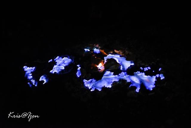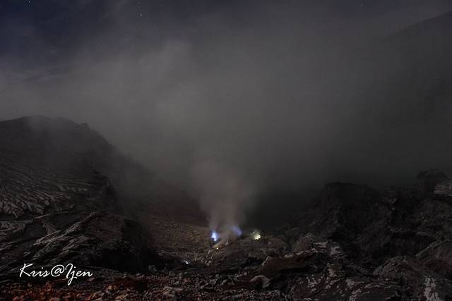 心急火燎的奔赴火山口,想一睹蓝火,奈何具体太远,烟雾缭绕下,只能看到隐约一点蓝火的影子,这是用70的焦段拍的。好吧,和我想象中大气磅礴,充满诡异气息的蓝火比起来,这最多算一缕蓝烟…