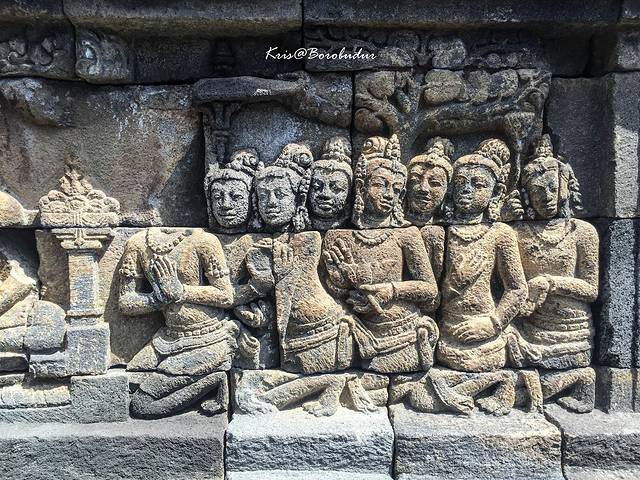 婆罗浮屠由六个广场平台外加三个圆形平台组成,下面的平台人略少,每一层都有精美的雕刻