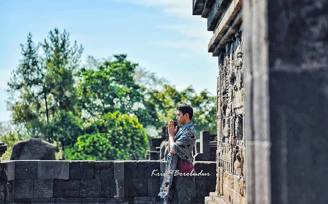 婆罗浮屠- 喧闹的人群中依然有人在虔诚的祈祷
