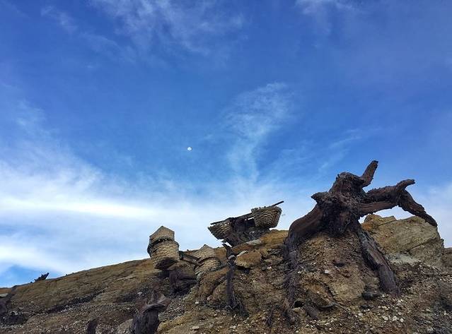 海拔渐高,视线越发开阔,走走停停大概需要一个半小时走到火山口,一路遇到不少矿工, 每一个都挑着满满当当几箩筐的硫磺矿,之前看很多人的帖子点评都在感慨矿工生活多艰辛不易,但是人各有命,而且艰辛的人生实在太多了,我就不在这里发挥我廉价的同情心了。。。