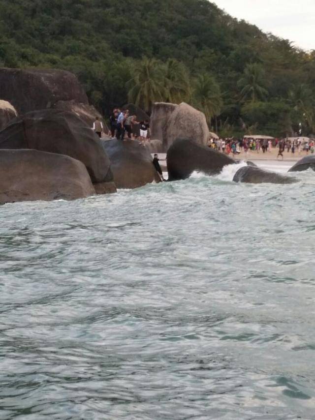 我们估计,他是想从一块石头跳到另一块上,结果踩滑了,卡在了两个石头的中间。旁边石头上,几个人一直在跟我们招手,一开始我们以为在和我们打招呼,船靠近了才发现,是要我们开船过去救人。但开船的师傅不同意,说根本开不过去,那里全是礁石,只能等已经到海滩的工作人员和警察想办法救援了~~~~~~~~~