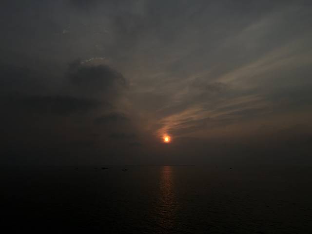早上6点起床看日出,厚厚的云层时有时无的遮挡住太阳,太阳透过云层,散发着光彩,美丽的光彩在平静的海面冉冉升起,一切都太平静,让人忍不住发呆😶