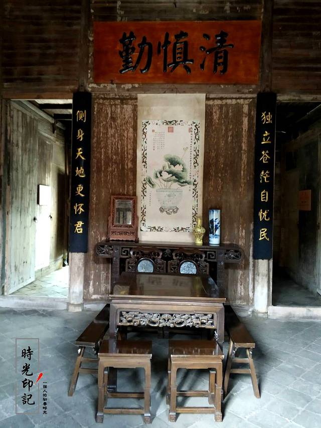 西递每家的堂屋的桌子上都可以看到瓶子,钟这两样物品,寓意“终生平安”。屋子两侧的半圆桌子,只有在男主人在家的时候,才会合起来使用。