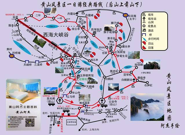 早上7点多老板开车把我送到黄山景区南大门,在南大门买好大巴车的票,经过20多分钟的车程,到达黄山售票处。售票处旁边有个小屋里也可以买票,票价一样,但是人要少许多。我是后山上前山下,基本是按照下面的这个线路(红线)走的,不要相信网上说,索道人很多,有排队的时间,也爬上去,坐索道10分钟,爬山需要2-3个小时,如果你不赶时间或是体力很好的,可以全程徒步,否则还是老老实实地坐索道吧。从云谷寺坐索道到达白鹅站后,真正的爬山才真正的开始。晚上在光明顶住一晚,第二天早上看完日出,爬完天都峰,然后徒步下山,到南大门大约是3点多的。