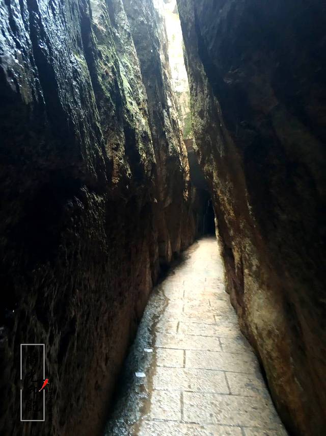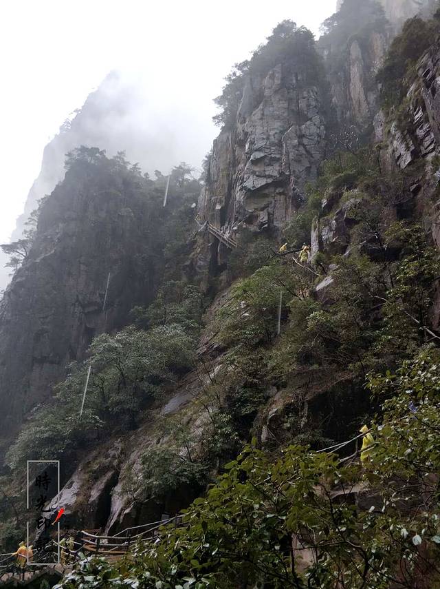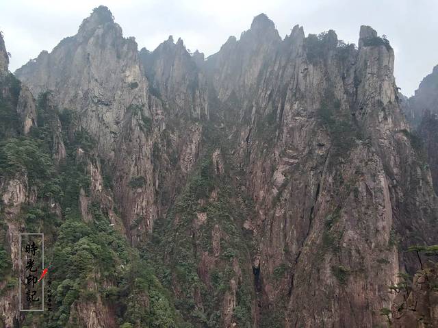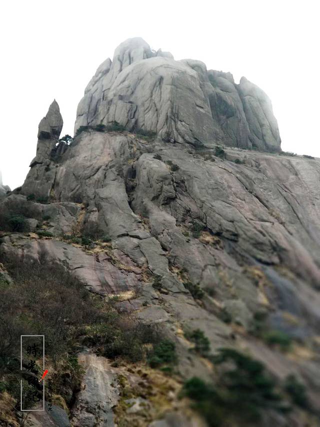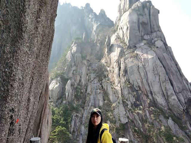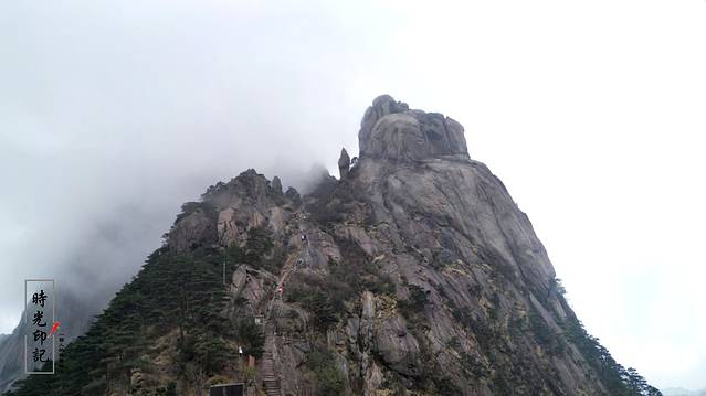 山脚下仰望天都峰,天气不好的时候,那个小门就会关闭,防止发生危险。