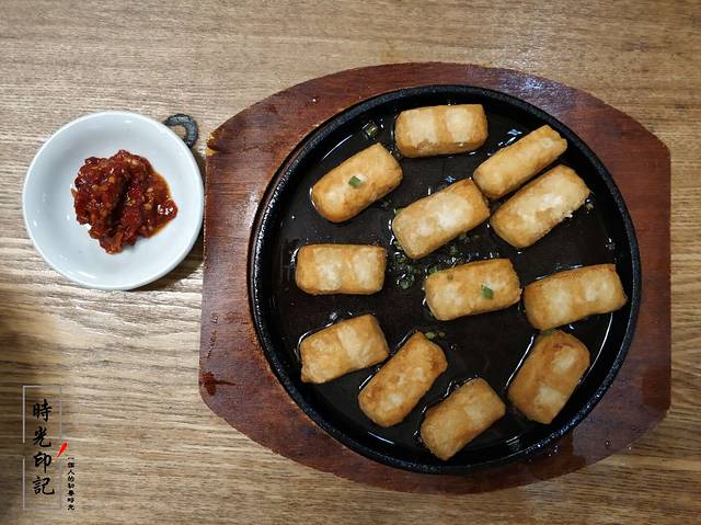 铁板毛豆腐。毛豆腐是徽州地区(今安徽省黄山市一带)的特色传统名菜,是通过以人工发酵法,使豆腐表面生长出一层白色茸毛。这首菜外皮比较脆,但是里面的口感,有点像北方豆腐要坏不坏的时候,不太适合我的口味。