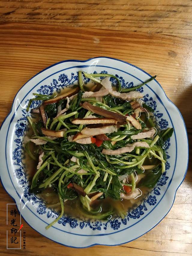 鲜笋炒腊肉,这道菜是在汤口镇吃的,可以说是最不好吃的一道菜。首先,腊肉跟在宏村吃的完全是两个味道,这个腊肉就像是平时做的红烧肉再次回锅一样,并且姜放得很多,盖住了笋的味道。