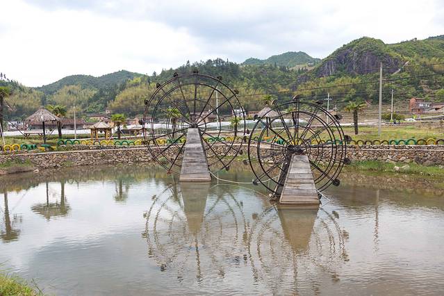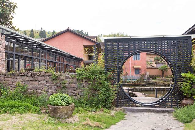 民宿门口的水车非常醒目,穿过仿造客家寨子搭建的门楼,可以看到用石块搭建的萧墙。