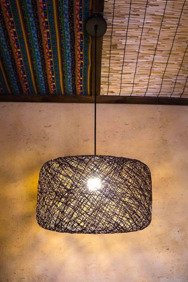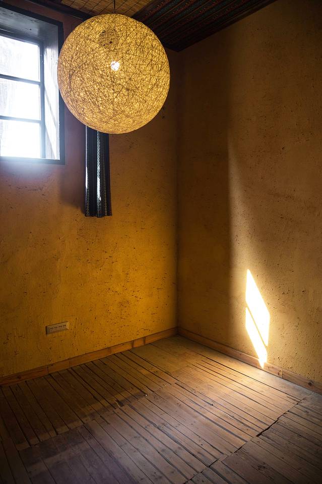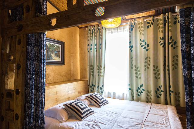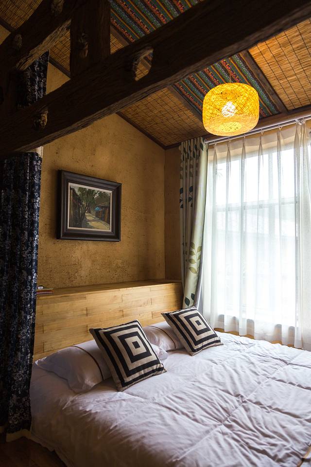 复古的床架上垂下印花蓝布帘,抬头看到用大花被与竹蔑做成的天花板,镂空的竹灯散发温暖的光,撒在夯土墙上,映射出岁月的余晖。
