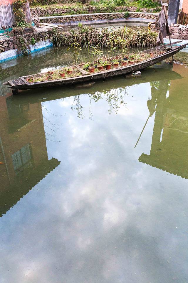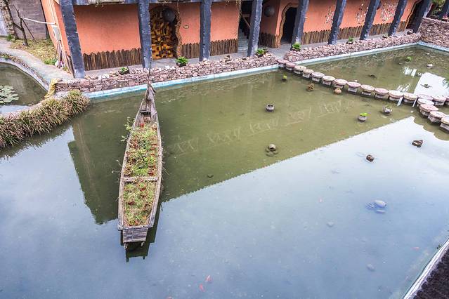 民宿不是很大,三栋建筑环绕式围成,中间的水塘里鱼群欢游,形成了居景合一的设计形态。