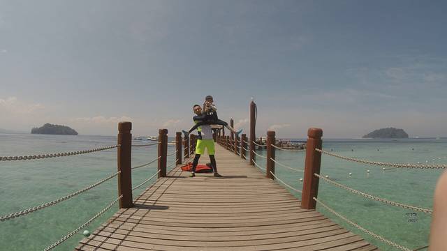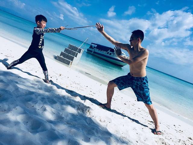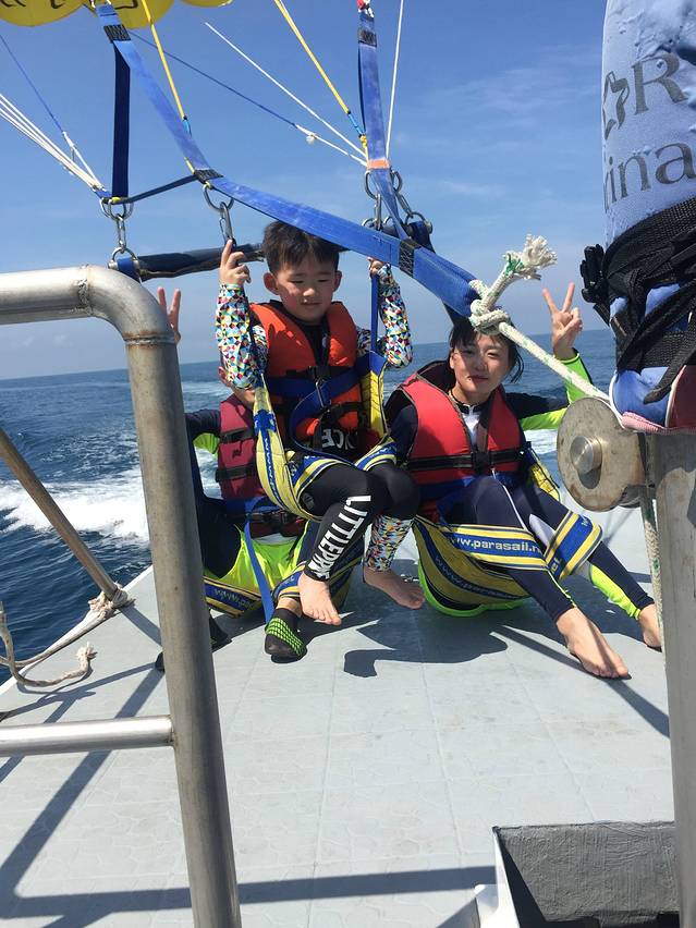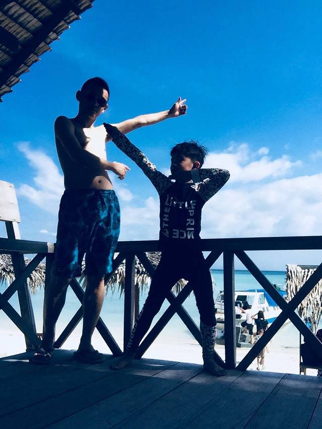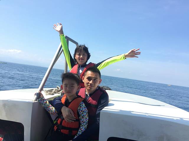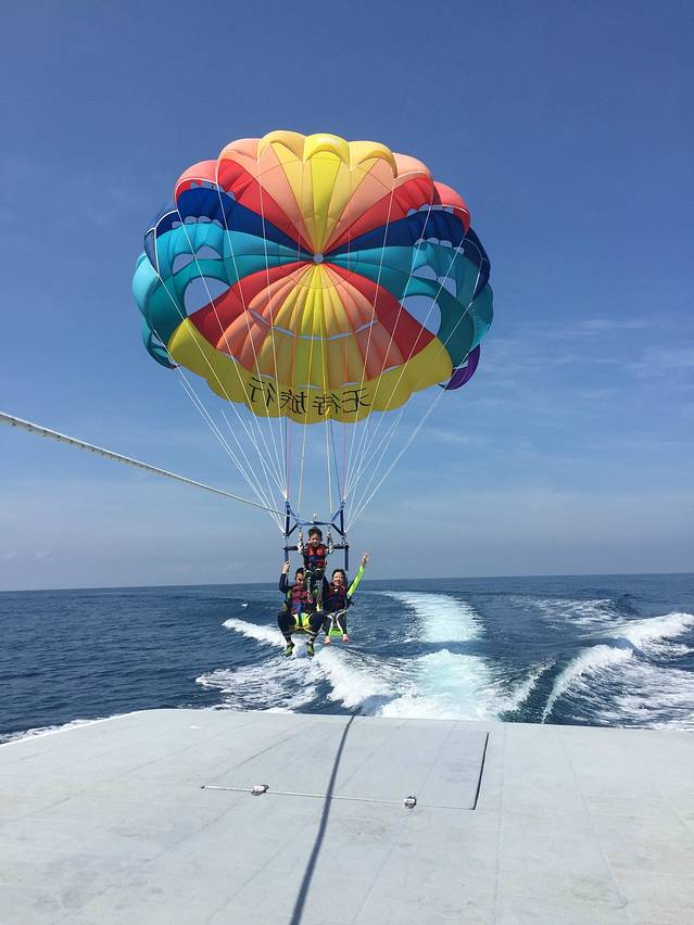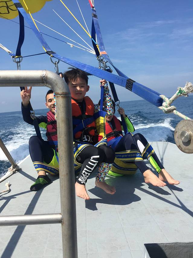 由于沙比岛路程很近,所以早上旅行社接的不是很早,也给我们充足的吃早餐的时间,早上8点半接的,从凯悦酒店到码头只需要几分钟的时间,然后从码头乘坐快递前往沙比岛也只需要15分钟,所以我觉得去沙比岛其实很方便,只是景色自然没有美人鱼岛惊艳。可是水依然很清澈~~水里游很多鱼。因为我们报了拖伞的项目,所以一到岛上面,就去换衣服,跟着船员去玩拖伞。拖伞就是起飞和降落的时候有一点点小怕,其实在空中是非常平稳的,然后中途下降点一下水,然后再升上去,感觉就像放风筝。蛮好玩的