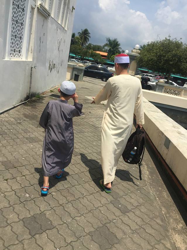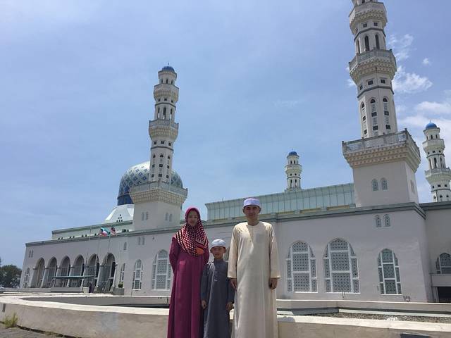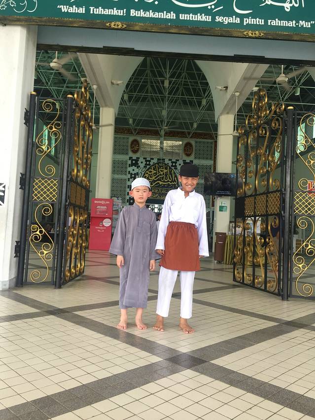 吃完饭了,我们就打车去了水上清真寺,由于是穆斯林,要进入清真寺对服装是有要求的,于是我们就在外面租了当地的衣服,进去的。5马币一套。也不贵,可以进去体验一下