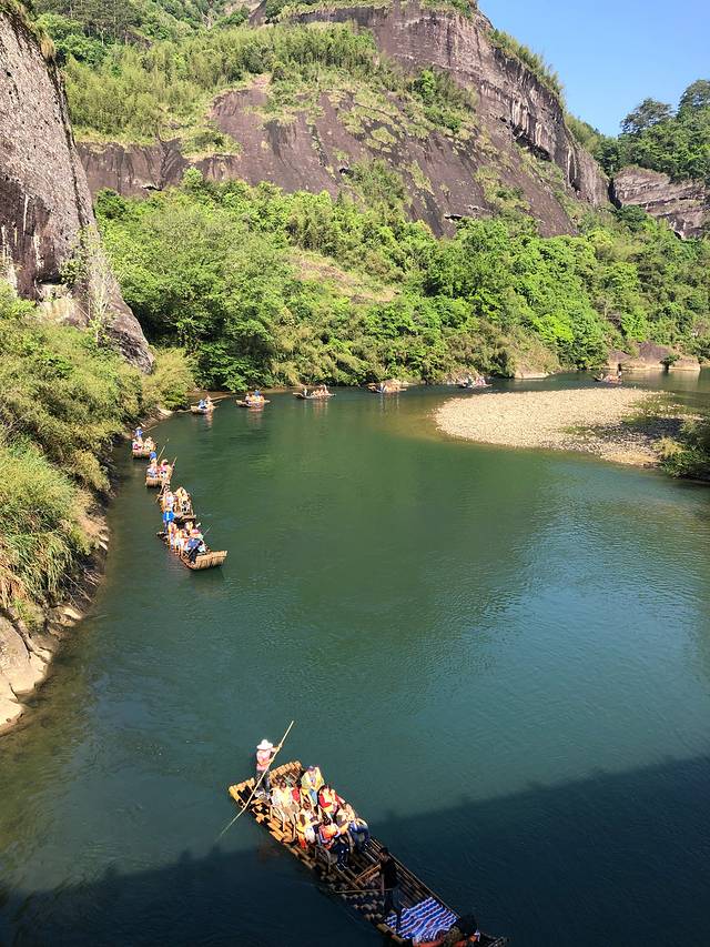 离开一线天,我们就坐车是竹筏漂流码头,需要门票和身份证一起得个小票,然后6个人一船,淡季可以随去随走,不用按票面时间,像我们是13:20的船,我们12:00到那也可以办理上船,上船前讲一定记得买鞋套,竹筏会溅水,鞋套1元一对,到处有卖。上船后船工会问是否讲解,20元每人,我们船6人都认为没必要讲解,我观察了下需要讲解的船廖廖无几。估计不讲解船工心情不爽,一路不讲话,我们就默默地欣赏风景,船工就一路超船,我们观景是中午,太阳🌞特别晒,两岸风光对于本就生活在南方的我没什么稀奇的,渐渐就开始进入了梦乡,等我醒来已快到岸,船工已超到前五名了。游览时间1个半小时。