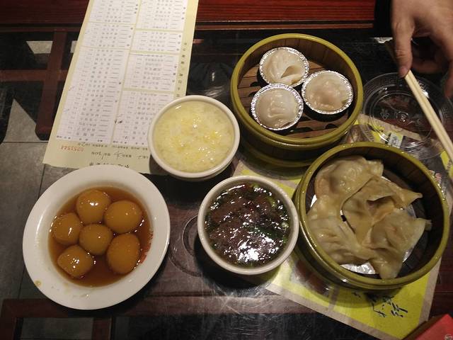 两人吃了糖油粑粑、甜酒冲蛋、虾饺、蒸饺和龙脂猪血,一共四十元。还不错!
