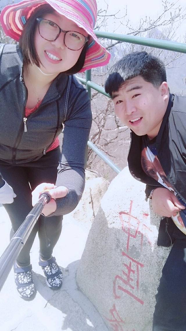 标准游客照!拍了半天,不是他不看镜头,就是我不在镜头里,最后就这样了😂对了,爬山必备手套,我从家里带了!还有必备帽子,必须挂脖子上,山顶风超级大!