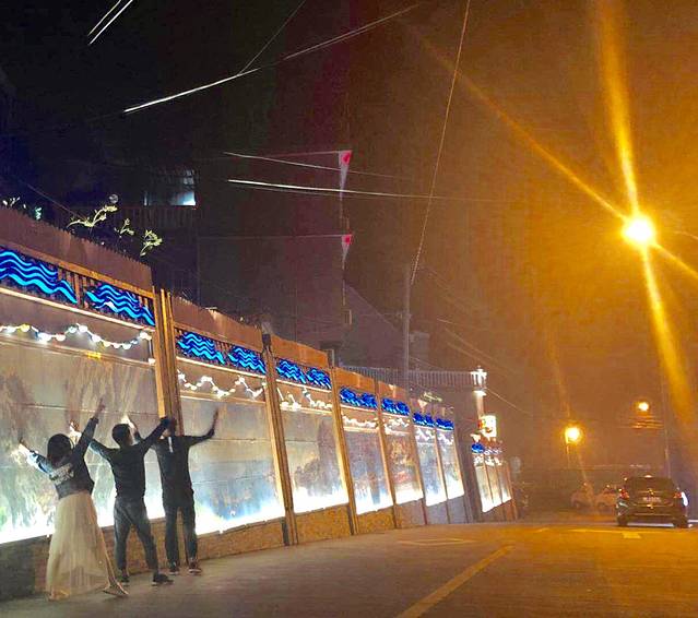 这次旅行几乎收尾了,夜晚的最后时刻,在路灯与路边风景墙壁的衬托下,给他们三拍了这张照片,按照大小个排列,很合适