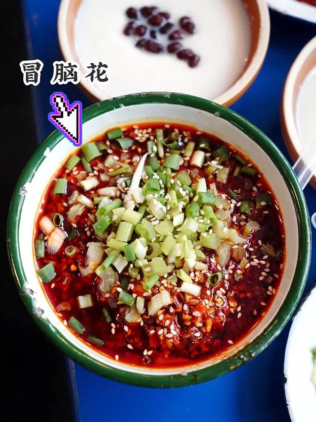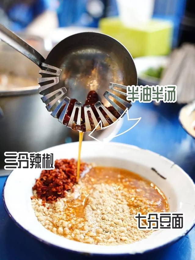 马路边边除了串串还有很多冒菜,吃完里面的食物后很多人会选择用剩下的汤底做沾水,每个冒菜的放料都稍有不同,有加豆面的、加剁椒的、加豆豉的,所以风味也不同