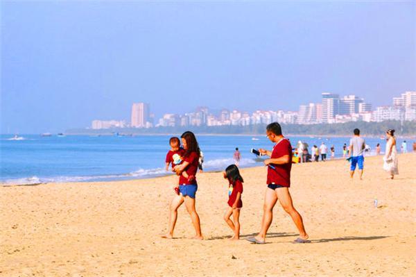 晒着太阳很舒服,还看到了这一家四口应该没猜错就是一家四口情侣衣服幸福的一家子沙滩上很多人还有一些外国人。