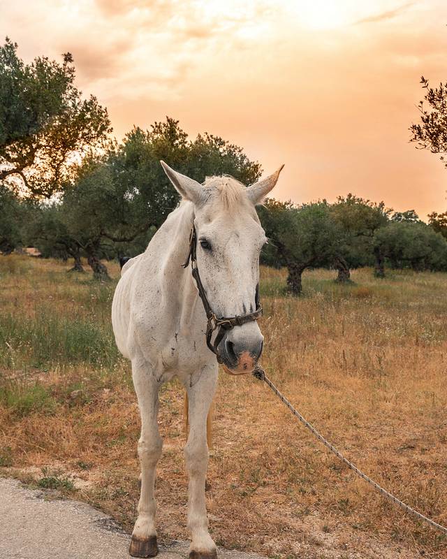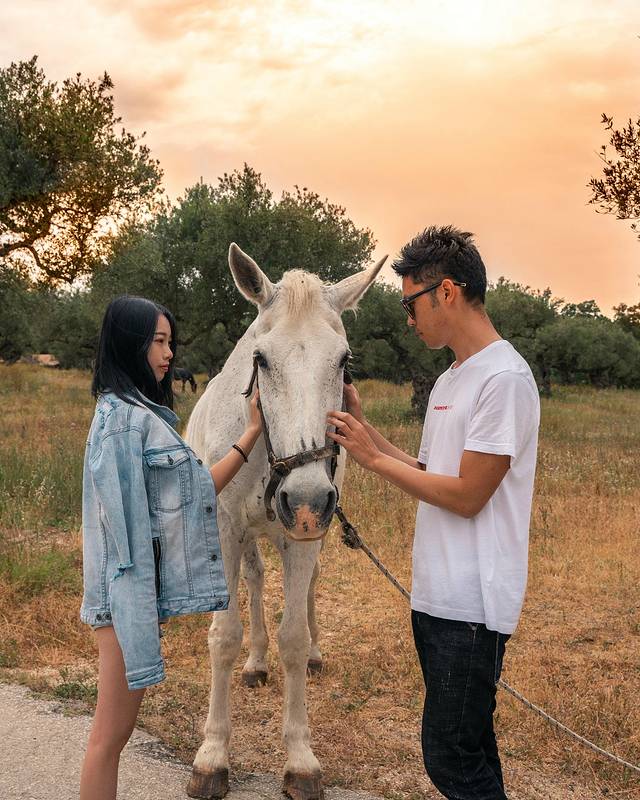 在我们开车回酒店的路上,我们经过的一片草地,里面有好多被拴着的马,扎金索斯的特色之一就是可以免费骑马,但我们觉得太晒太热了,就没有预约骑马,但此时看到那么多马,我们当然不放过任何拍照的机会啦,杰西喜欢这匹白色的马,于是在经历很多次试图摸马 —— 马动了我们后退 —— 再试图摸马这个循环之后,我们顺利地摸到了这匹白马并跟它拍了照片。