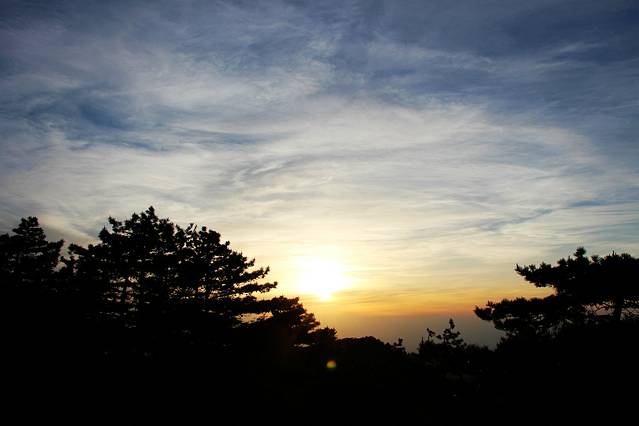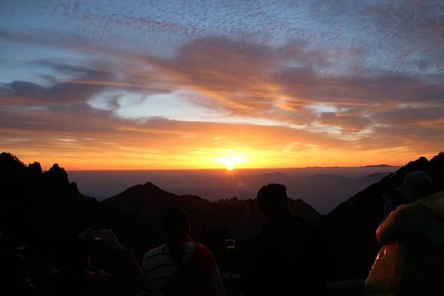 前面忘说了,黄山原则上是不允许夜爬的。大门早上6:30开放下午4:30关闭;缆车早上6:30开放下午5:00关闭。如果您4:30前进大门要夜爬黄山看日出虽然没有管理人员会制止您,但不管你是从哪个大门进入的,正常的速度8—9小时后你都已经在山顶了。这时也才凌晨1—2点钟,你要再等上3—4个小时太阳才会出来。加上黄山的美景大多在海拔1500米以上,当你从大门步行到达这个高度时需要3个小时左右。当时天已经黑了,你什么也看不清,如果继续前行将会错过一些难忘的美景。(黄山的山势决定了后山上前山下少走回头路还可以饱览两边的美景。)所以我和爱妻才选择在山顶住一晚。
