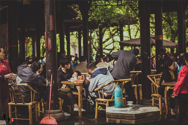 步入茶社,布局较散,在人民公园内的一角,沿着长廊而设。人们三五成群的围坐,有人品茗,有人唠嗑,有人打牌,有人闭目养神。这就是成都的节奏。所谓天府之国,养人之所,成都一直以来都是慢节奏而闻名于世,然而这种慢的表达方式却是多样的,茶馆就是其中比较大众的一种。就如我镜头下的场景,工作日的下午,一个刚放晴的天气,人一点不见少,这就是生活习惯。最真实的成都就在这里。
