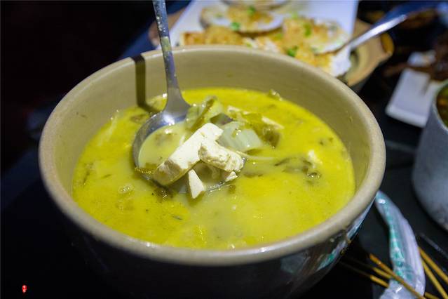 接下来我要重点推荐一道菜了,名字叫特色烤鱼片。首先不说味道,我想说的是这道菜是一道一分为二的菜品。这是什么意思呢?简单的说,就是一鱼两吃咯!先把鱼肉剔出,穿成串,用泡椒味覆盖,烤鱼片的特色就是让食客即能体验到鱼片的嫩滑爽口,又能从泡椒中体会到酣畅淋漓。这是第一种吃法。第二种就是把一条鱼剩下的部分拿去熬汤,汤中加入酸菜作为主要调味元素,一锅酸菜鱼汤就能呈现到面前。这道菜的特色首先是清淡,酸菜虽然在腌制过程中会有一定的辣椒元素,但总体来说味道都不会太浓,可供不能吃辣的人群享用!鱼汤可口,老少皆宜!