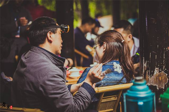 在茶社拍摄,你不能回避一类人,这就是采耳师,本地人称:挖耳工。这是一类什么人呢?就字面意思你不难理解,他们就是帮你清理耳朵里面垃圾的人。如果你没有去过四川,你肯定会想,挖耳朵有多难呢?自己在家买个挖耳勺也可以弄两下啊,何必要找人操作呢?而且别人挖耳朵,轻重怎么掌握呢?其实每个人在没有体验过之前都有所担忧,特别是看到这些职业挖耳工的工具后,你更会胆寒。因为他们大多数都装备齐整,而这些装备活像要为你耳朵做一次大手术,很多签字,还有类似大钳子的东西。但当你体验过之后,你会爱上这种感觉,其实很多工具,并不是我们想象中的那么操作,就如我说的“大钳子”,它并不会直接用在掏耳上,而是利用它的共振来让小签子达到最理想的震动效果,而让你耳朵里的东西震出来。这只是其中的一项妙招,而其他的更是高深莫测,我也很难用言语去表达。总之,体验一次,非常超值!