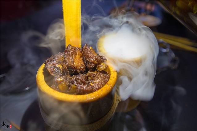 来看看他的新,用海鲜配上麻辣可谓是川粤结合的佼佼者。这道菜名叫裸奔坨坨虾,名字就很奔放啊。把白灼虾穿成串,然后在麻辣锅底里焖煮,让虾子完全的侵入锅底的精华味道。这道菜吃起来,既保留了虾子本有的海鲜鲜味,也掺杂着川菜里精髓的麻辣,两者完美结合,可谓浑然天成,口感不错!特别说明下,这道菜的打底是用的芋儿,一定要记得用筷子在砵底捞一下哟,很软,吃起带劲!