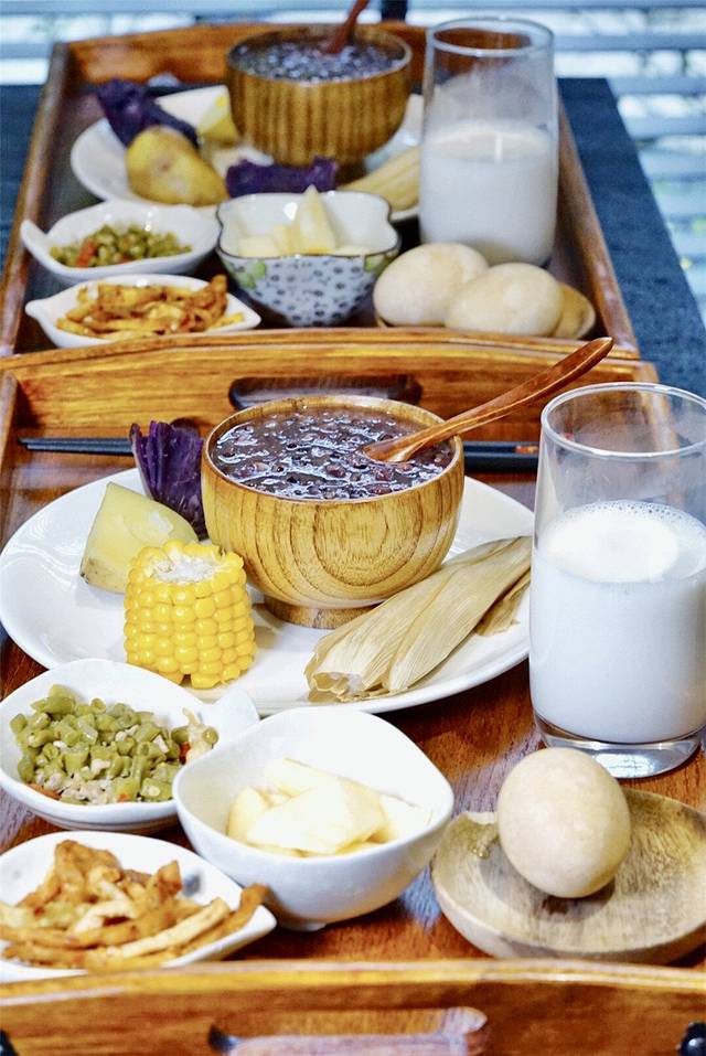 早餐的内容很丰富也很佛系,可以说是灰常养生了:黑米粥、牛奶、粗粮、泡豇豆、萝卜卷、玉米粑粑、鸡蛋和水果,不要觉得清淡,味道出乎意料的棒!
