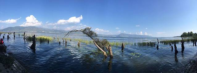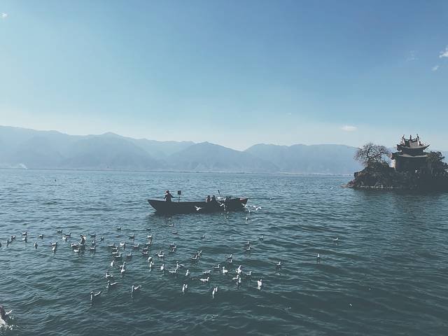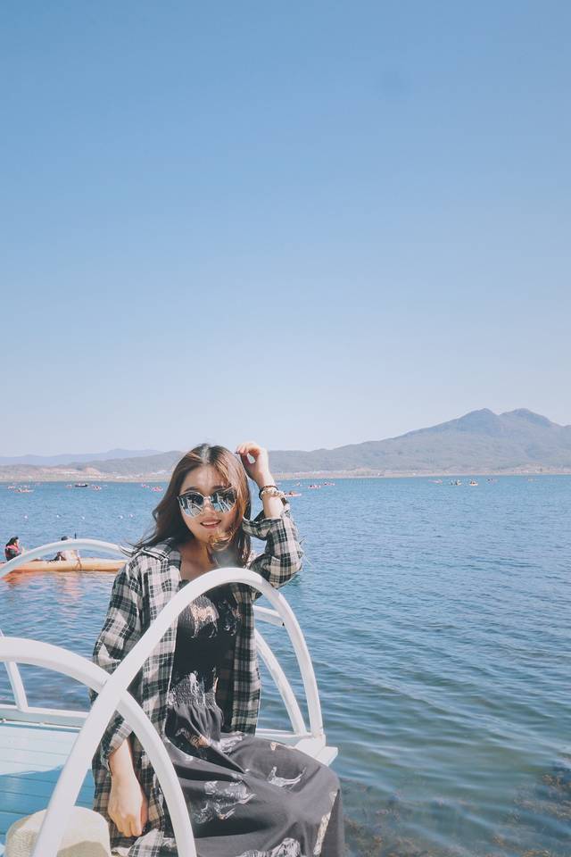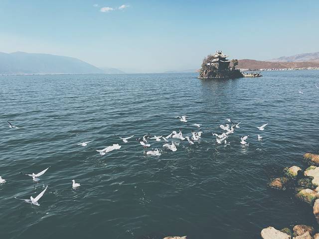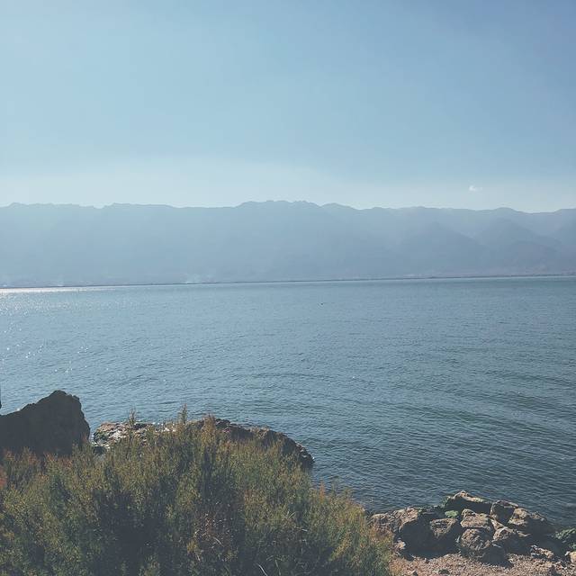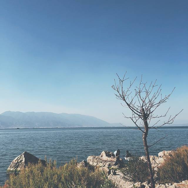 不同于海西,海东这边洱海水里很少看到有枯树,但是有很多石头啊!!哈哈哈😄,坐着、躺着、站着随便你怎么着,都可以拍拍拍!^_^背景就是洱海蓝色的水,用大光圈虚化效果就炒鸡好看呐!