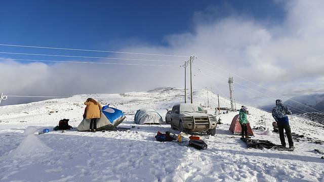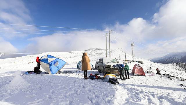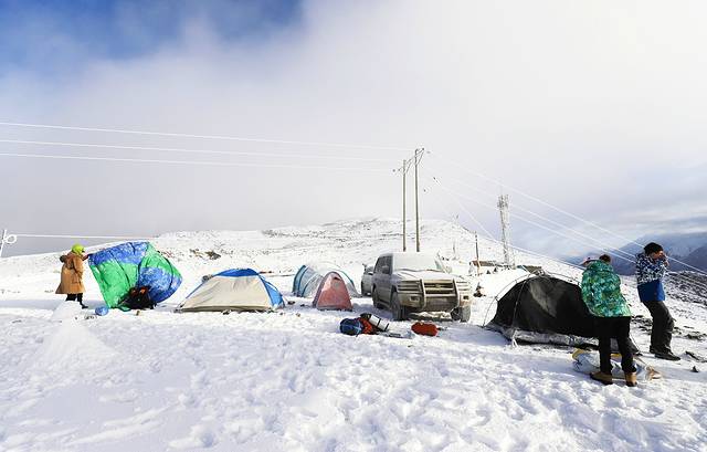 雪地里扎营不同于在一般的露营基地或者山地、土地上,即便是被碾压的死死的积雪,帐篷的地钉打下去也马上散掉了,只能够用兵工铲把雪都铲掉,让地表泥土显现出来,再开始扎营。为了保证两个帐篷都能扎得平稳,还得把防潮垫下面的部分都铲平,我们挪动了好几个地方,终于在晚上10点搭好了帐篷,尽管上山时才刚刚天黑。