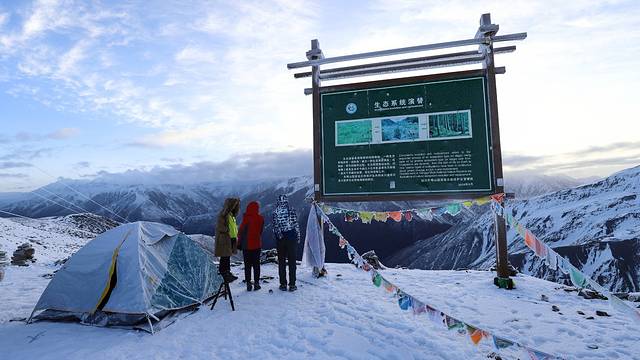又是一夜冰冷难眠,山顶温度太低加之海拔又高,几乎是一整夜伴着呼呼的风雪声昏昏沉沉,不过子梅垭口的雪后清晨还是给了我莫大的安慰和惊喜。风吹散了对面遮挡 贡嘎 主峰的云层,使他渐渐露出山尖,雪后初霁,连绵群山尽收眼底,又是一次意外的收获。
