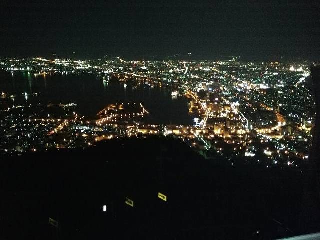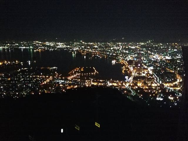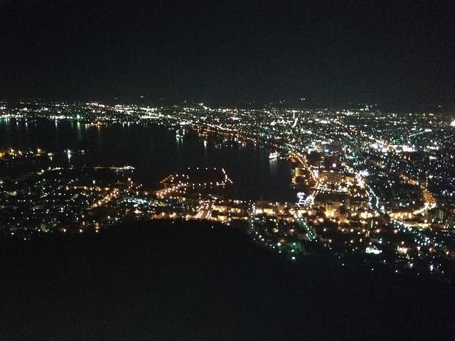 函馆山夜景的精彩之处在于城市的两边呈现出两条弧形的海岸线,闪烁的都市灯光与黑暗的海面形成鲜明的对比,美妙迷人。