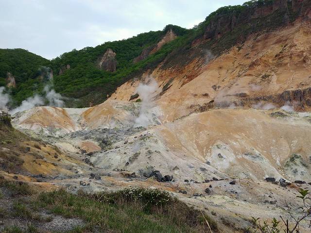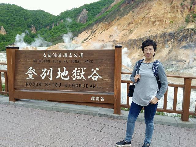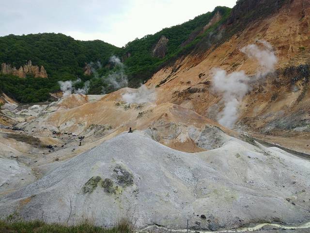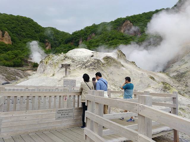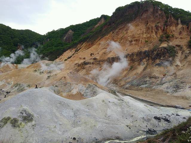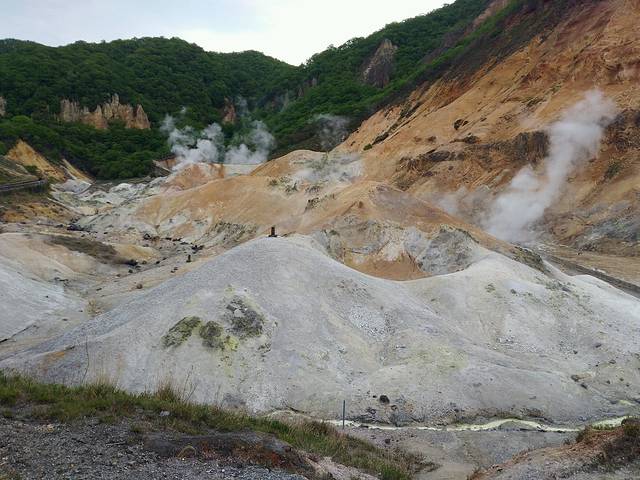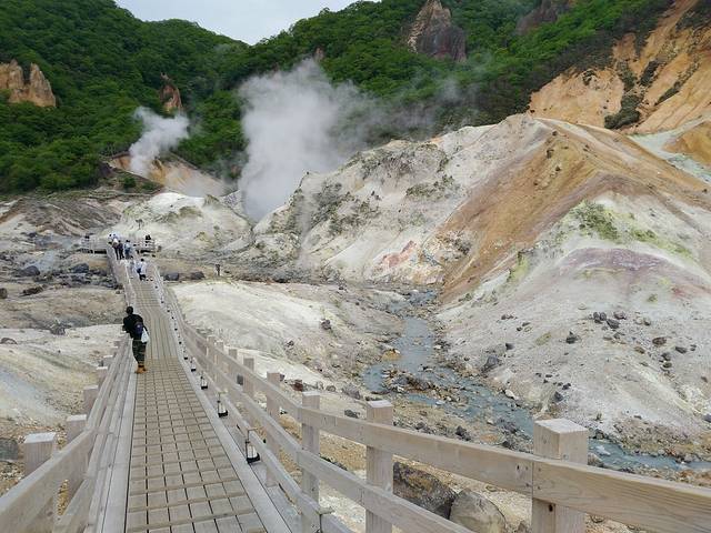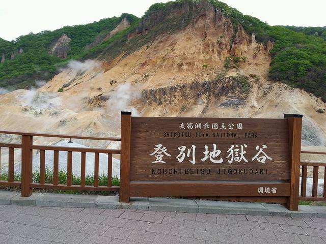 登别地狱谷是位于日本北海道登别市的一个火山口遗迹,临近洞爷湖。火山爆发后,由融岩所形成的一个奇形跪异的谷地;灰白和褐色的岩层加上许多地热自地底喷出,形成特殊的火山地形景观。这里十几种温泉♨各具特色,有的是硫化氢水质,有的是食盐水质,有的则含铁。特别是由地狱谷提供水源的登别温泉,海拔200米左右,是原始森林环抱的温泉疗养地。