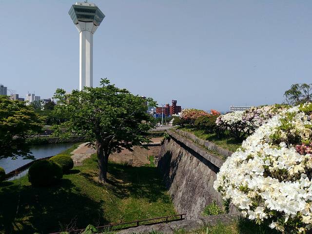 这座曾见证历史的城堡如今只剩下了城墙的外廓,城堡内被改辟为花园,遍植樱花,成为北海道有名的赏樱胜地。樱花绽放时,犹如一朵巨大的五角星形的粉色花朵。
