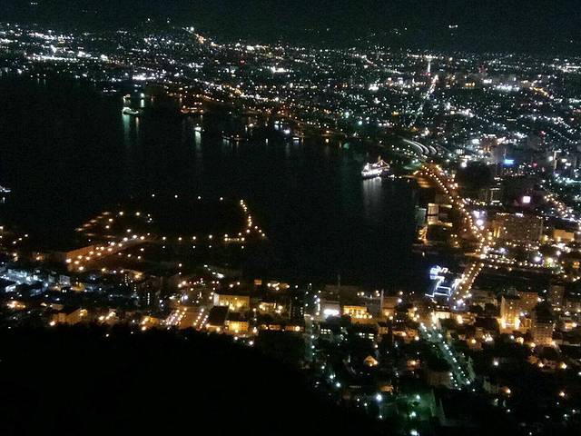 涵馆百万夜景。搭乘空中缆车前往山顶展望台眺望夜景。山顶有一个免费开放的展望台,在这里鸟瞰函馆,白天的市区街景尽显异国情调,入夜后的都市建筑及街道车流的灯光闪烁耀眼,充满了浪漫的氛围。