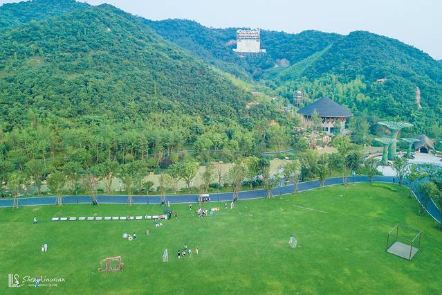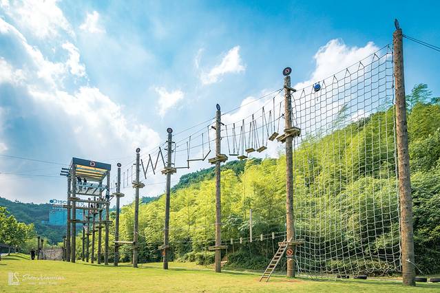 大片的草坪区域依山势起伏修建,地面障碍和高空网阵挑战设备就立于草坪之上,三层式结构分割合理划分出高中低三种难度、12米高的速降设备挑战每一位初学者的心理素质。