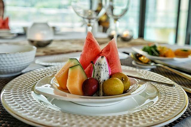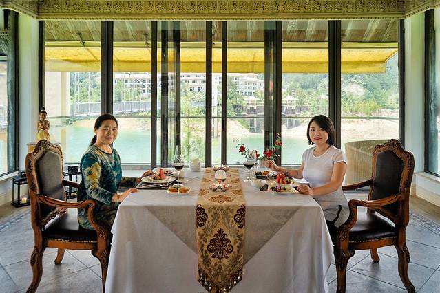 临窗而坐,午后最让人慵懒的时刻,在并不刺眼但仍有余温的阳光中悠闲地享受餐点的时光。酒店精心布置的餐具、花卉仿佛带我们到了私人花园、私人水域,缕缕茶香,阵阵花香。