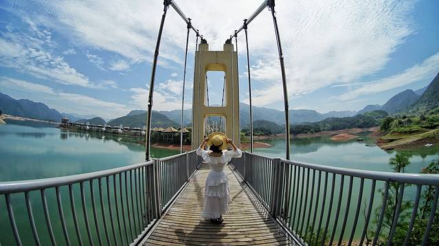 湖光山色,一道水面上的长桥宛若惊鸿把一座座茅草别墅串联起来。