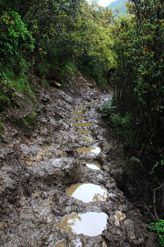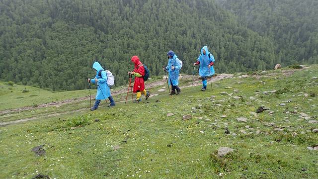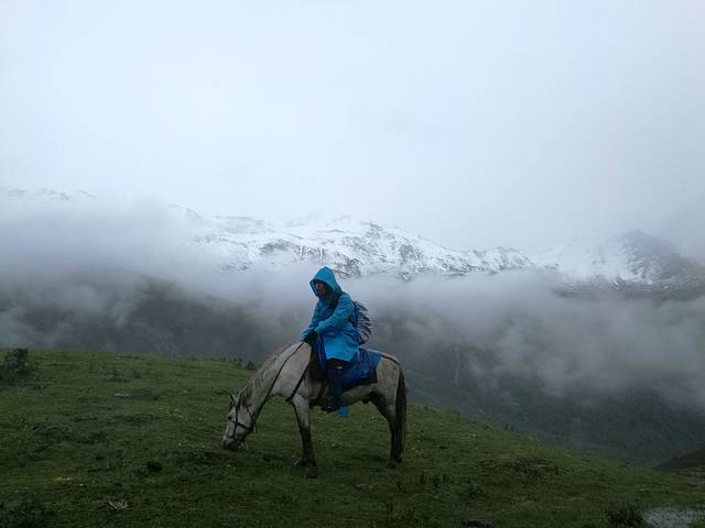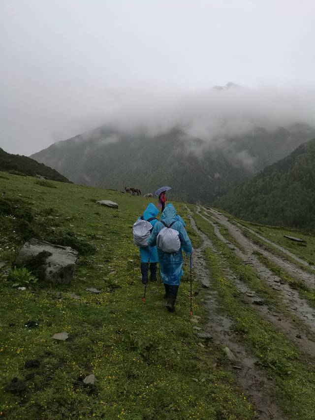 6月11日。今天是上山的日子。早上起来竟然下起了雨,天空阴绵绵的,一时半会停不下来。前一天晚上还在纠结要穿啥衣裤(速干衣裤VS冲锋衣裤),这下好了,ZX跟我们说冲锋衣裤登山鞋全部穿上,外加雨衣雪套。天气正常的话,8点吃早餐,8点半出发上山。我们吃完早餐后,在ZX家愣是等了将近两个小时,巴望着这雨能停下来,实在不行小一点也好。这天气让我们失望了。于是在雨中,我们向海子沟出发了,颇有壮士的感觉。高海拔、下雨、马道,还是有点刺激的。小时候学的语文不是有一篇《雨中登泰山》吗,我们这是雨中登四姑娘山。这一路压根就没遇见过其他上山的同志,下山的倒是遇到一些。问他们登顶了没(大峰二峰),很多是因为雪大而没有登顶的(山下下雨,山顶下雪)。在雨中坑坑洼洼地走了5公里马道,经过锅庄坪、石板热,来到打尖包。一路云山雾绕,时而高山草甸满地小花,时而穿越树林鸟鸣虫吟。风景的优美让人忘了这是在雨中漫步。在打尖包,买了几碗牦牛肉,就着青稞饼围着火炉吃。在这寒冷的夏天,一碗滚烫的牦牛肉汤下肚去,那是相当舒服的。休息片刻,下午两点多我们开始骑马上山,一共七匹马,四匹驼人,一匹驼柴,两匹驼大包行李。YB、HH、JJ的马都有协作牵着,我的马,协作把缰绳递给我,让我自己骑……协作说这匹马比较听话……我骑的这马也挺有意思,看到离前面的马距离比较远了,它就会一路小跑追上去。这样的路,这样的天气,我挺紧张的,毕竟家有老小啊,这马甩个头,扭头去旁边吃个草都能让我的心砰砰直跳。果不其然,刚从打尖包出发不久,在一个小斜坡上,碰到几位从二峰下来的骑马同志,那匹背柴的马不知受了什么刺激,长啸一声,拼命甩下柴,从斜坡上直冲而下,这货竟然没有摔倒,差点撞着一个协作,幸亏人家身手敏捷闪得快,一转眼功夫,那匹马消失在来时的路上。其他马不知有无吓着,反正我是被吓着了。协作安定好其它的马,去把背柴的马拉了回来,也不敢再让它背东西了,把柴加到其中一匹背行李的马上(老实就是吃亏啊)。耽误了十几分钟,继续出发。一路紧张,特别是在高山草甸上走的时候,旁边就是斜坡,这马要是失足,我们足以滚到山下的海子里去……可以看到对面的雪山,融化的雪水在山中辟开一条水道流到山下的海子里。走到大峰与二峰的岔路口,雨大雪大,协作问我们要不要改登大峰,我们没改变主意。骑马走了两个小时左右,据说是11公里左右,平安到达二峰大本营,海拔在4200米左右。大本营除了一个看门的老大爷,就是我们这个队伍了,其他登山队估计都是因为下雨没上来。这里没水没电,水要拿桶去后面的小河里装,晚上照明要用头灯。大家选择好住的地方,四个人并排一个炕上,每个人一个睡袋。收拾好了行李后,围着柴火堆烤火吹牛皮,衣服袜子有些湿的,顺便弄干。协作们整理好之后给我们弄晚餐,当归煲鸡、炒肉片、炒土豆、青菜、米饭,话说在海拔这么高的地方能有这样的伙食,还是相当不错的。饭后趁雨小在周围转了一圈,也不给那么早睡觉,协作说天黑后才让睡。百无聊赖,又跟协作们在柴火旁吹牛皮快到9点,天终于黑下来了,雨也快要停了,我们也要睡觉了。晚10点起来,竟然可以看到满天的星星了,这高山上的天气真是说变就变。一晚上没说话,夜里有呼噜声,有不明物体撞门声,有小动物在屋梁上快速爬行声。
