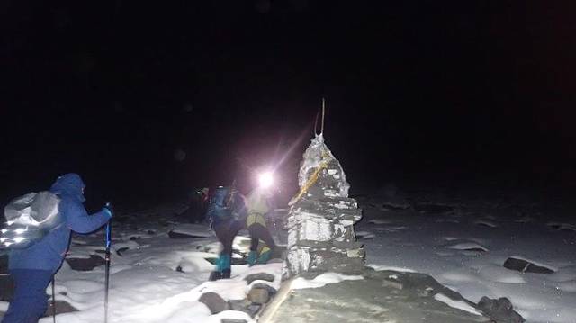 6月12日。凌晨2点,闹钟把我们叫起。穿好衣服跑到外面一看,满天星星,银河很是亮眼。大家都说晚上没睡好,但YB和我都听到了呼噜声。戴着头灯,一边聊着一边收拾。2点30分,协作们煮好了片面给我们当早餐。吃完早餐后,3点05分,背上冲顶包出发了,队伍最前面有一个协作开路。从大本营出发不久,是一段比较陡的路,很短的路程就让我们呼吸急促起来。大本营后面有一条小河,山上的雪水冲下来形成的,踩着河里的石头过河。眼见着前面的协作踩到石头上滑了一下,我心里已经有所准备,一踩上去还是差点滑倒,前面的协作和后面的YB都拉了我一下,还好大家都平安过河。丫的,原来是石头上面结了一层冰。大本营上去不久,雪慢慢多了起来。我们发现,在雪地里跟着人的脚印走是比较省力气的,调整好脚步、登山杖、呼吸的节奏也是可以让自己不那么累。一路上很少说话,基本上就是埋头前进,黑灯瞎火的,也看不到什么风景,又因为呼吸急促,同时说话也会消耗我们的能量。到了雪厚一点的地方,有一些动物爪印,协作说是狼。开始时JJ走得很快,把其他三人拉得很远(年轻就是好!)。慢慢地,又被我们超过,落在了最后,也不知是不是出现了轻微高反让他难受。我一路基本上都跟在HH后面,不卑不亢,不紧不慢。中途停下来休息了几次,主要是补充水分。四个人里面,我比较担心HH,主要是他重,消耗大,也担心他膝盖受不了。我让我前面的协作跟紧HH,别管我了。在离峰顶几百上千米的地方,协作给我们换上了冰爪和雪镐,扔掉了登山杖。已经可以看到阳光洒在远处的雪山上,只是我们在背阳的一面,完美错过日出了。越到后面越辛苦,体力越来越少,雪峰越来越陡,加上前一天山上下了整整一天的雪,雪比往日要厚很多。HH说他快要虚脱了,我们也只能给他加油,他也只能坚持,因为他女朋友已经把预祝他登顶成功的牛逼吹出去了,哈哈。厚厚的雪盖住了保护站钉在那里协助登顶的钢绳,我们只能通过协作自己开路上去。在那最后一段陡峭的攀登过程中,我心里想着尼玛等一下该怎么下山。我们走得小心翼翼,因为万一失足滚下雪山去,后果不堪设想。7点50分,有惊无险登上峰顶,在那一刻,所有的疲惫都抛之脑后。遥望四周,无数的雪山在我们之下,更有“一览众山小”的感觉。幺妹峰就在我们面前雄伟地矗立着,可望而不可及,我觉得这辈子也只能仰望她了。雪山之巅风景无以言表,只能用图片代之。兴奋只是一阵的,很快我们就要下山。上山容易下山难,还好我的担心是多余的,劳动人民的智慧是无穷的。刚从峰顶撤下来,走过最险的那段路,便有一个协作在前面坐在雪地上往下滑出了一条天然的滑雪道,我们依次坐下来,顺着“滑雪道”滑雪下山,用冰爪和雪镐当刹车,其乐无穷,那一刻,我们都是小孩子。雪厚的地方才能滑,过了雪厚的地方,我们开始走路下山。JJ走得飞快,估计是缓过神来了,YB和我走在中间,HH体力透支比较大,有个协作跟他一起走在最后面。一路没遇到其他人,10点左右顺利回到大本营。在此特别表扬HH,不用我们扛下山,哈哈。从大本营回打尖包,继续选择了骑马,为了消除我的顾虑,同志们特意让协作给我安排了一匹乖马,同时有个协作牵着。回到打尖包补充了些食物,继续徒步5公里下山。今天天气很好,一路基本上没有下雨,路面也已经干了不少,马道比前一天要好走很多。下午4点多,回到ZX家。考虑到洗澡睡觉的问题,我们决定当天回成都。ZX给我们联系好了回成都的汽车。在ZX家收拾了一下,我们坐车赶回成都,晚上8点半左右到达酒店。吃饭洗澡睡觉,不在话下。这晚估计大家都睡得挺好吧。